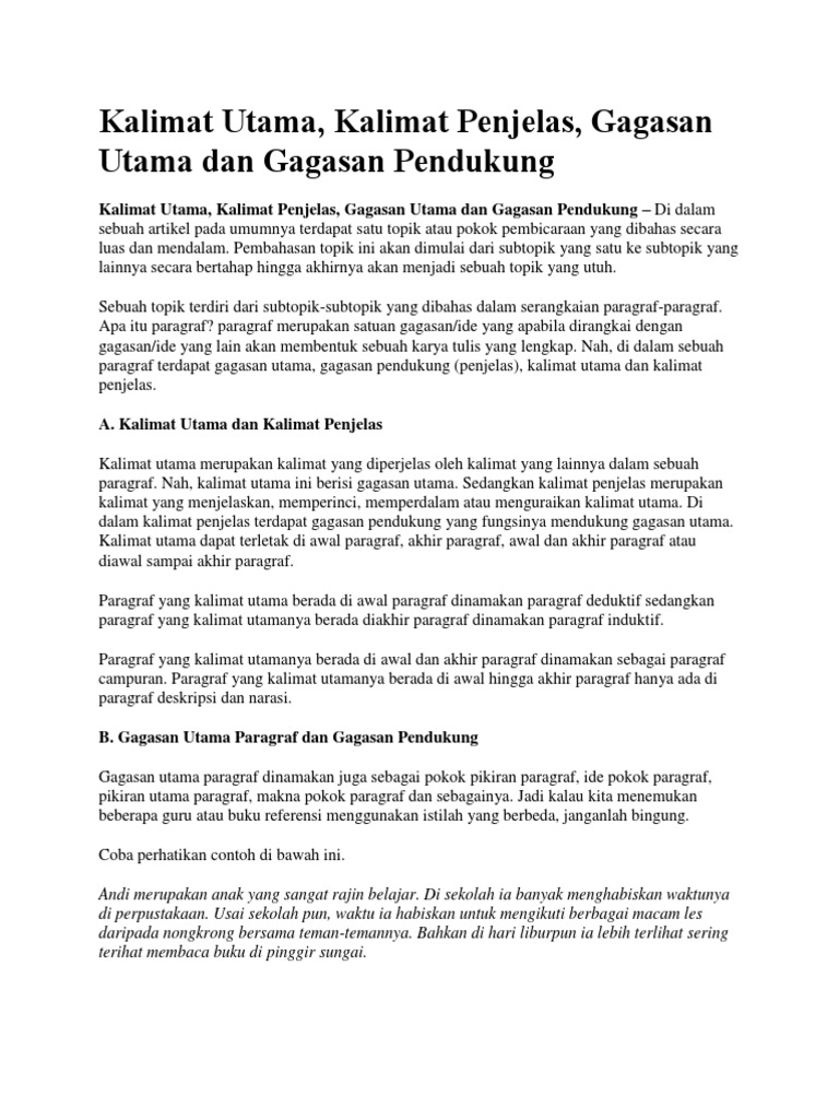 Mengandung permasalahan yang dapat diuraikan lebih lanut. Contoh untuk kalimat yang utama yang berada di akhir paragraf. Kalimat utama adalah kalimat yang memuat ide pokok dan menjadi pengendali sebuah paragraf serta sebagai dasar dalam mengembangkan sebuah paragraf. Kalimat utama sendiri merupakan pokok pikiran yang utama atau bisa disebut juga sebagai ide pokok yang menjadi dasar untuk mengembangkan sebuah paragraf. Campuran 2 lihat jawaban naturefoxy28 menunggu jawabanmu. Permainan game online bisa dimainkan oleh siapa saja dengan menggunakan hp atau gadget android miliknya. Macam paragraf berdasarkan letak kalimat utama dan contohnya. 3 jenis paragraf berdasarkan letak kalimat utama. Penggunaan paragraf memang sering kita jumpai dalam berbagai penulisan mulai dari bacaan berita, artikel, hingga tutorial dan cerita fiksi memiliki paragraf untuk menguraikan gagasan utamanya. Kalimat utama dan jenis paragraf hai, irsyad f. Kalimat utama adalah kesimpulan yang diletakkan di akhir alinea. Terdapat juga beberapa kalimat pendukung didalamnya. Biasanya kalimat utama terletak di awal paragraf.